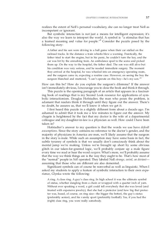 Example of Symbolic Interactionism You are entering an office to interview for a job When you arrive, the man interviewing you greets you at the door of his office with a handshake and a warm. Symbolic interactionism is a sociological theory that develops from practical considerations and alludes to people's particular utilization of dialect to make images and normal implications, for deduction and correspondence with others In other words, it is a frame of reference to better understand how individuals interact with one another to create symbolic worlds, and in return, how these. Symbolic interactionism as a theory to understand the microlevel phenomenon of the society was given by George Herbert Mead, though he did not do much work on thisIt is a sociological theory, also known as a symbolic interaction perspective Symbolic interactionism focuses on looking at the actions and interactions among the individuals rather than at the group level.