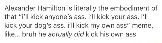 Alexander Hamilton Is Literally The Embodiment Of That I Ll Kick Anyone S Ass I Ii Kick Your Ass I Ii Kick Your Dog S Ass I Ii Kick My Own Ass Meme Like Bruh He Actually Did