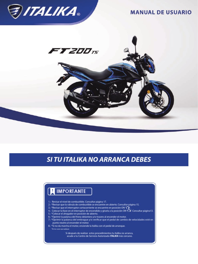 En el caso de compras de motocicletas la factura de la motocicleta es el único documento que avala la propiedad del bien, y se requiere para poder realizar los trámites de emplacado Te recomendamos validar la información de facturación que proporcionas durante el proceso de tu compra. Un casco de regalo, póliza de garantía y manualFicha TécnicaFrenos delanteros Freno de tamborFrenos traseros Freno de tamborLlanta. Encuentra Manual De Ft 150 Italika en MercadoLibrecommx!.