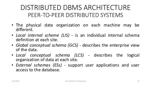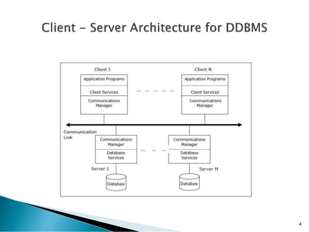 Required data in a computer that manages a database This architecture model provides Software Developers to create Reusable application/systems with maximum flexibility In Ntier, "N" refers to a number of tiers or layers are being used like – 2tier, 3tier or 4tier, etc. Peer toPeer Architecture for DDBMS In these systems, each peer acts both as a client and a server for imparting database services The peers share their resource with other peers and coordinate their activities This architecture generally has four levels of schemas −. 1 A peer sends the request for resource to all its superpeer !.