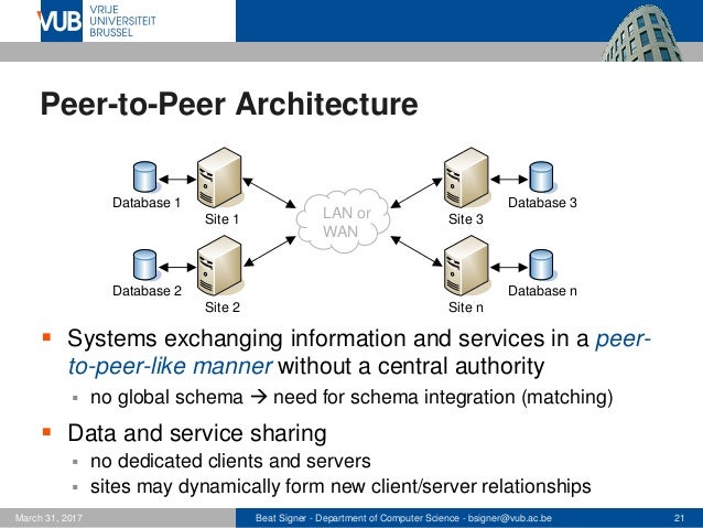 Peer to peer architecture in ddbms. Peertopeer pattern In this pattern, individual components are known as peers Peers may function both as a client, requesting services from other peers, and as a server, providing services to other peers A peer may act as a client or as a server or as both, and it can change its role dynamically with time. Below is the architecture for two node peer to peer replication As per the above architecture, we can see the application server is sending requests to both the database servers Both nodes A and B are replicating its data with each other If any DML statement is executed for node A, it is then replicated to node B and viceaversa. PeerToPeer network PeerToPeer network is a network in which all the computers are linked together with equal privilege and responsibilities for processing the data PeerToPeer network is useful for small environments, usually up to 10 computers.