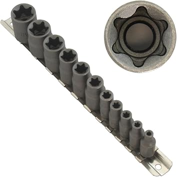 Visit the Neiko Store Neiko A Torx Bit Socket Set, Metric, T8T60 13Piece Set, S2 and CrV Ste Sold by boryn01 an eBay Marketplace seller add to compare compare now $399 $359 Craftsman 1/4" Max Axess Hex Bit Socket, 3/8Inch Drive Sold by Sears add to compare compare now. Set includes (5) 1/4 in drive ETorx sockets E4, E5, E6, E7, E8 (4) 3/8 in drive ETorx sockets E10, E12, E14, E16 (4) 1/2 in drive ETorx sockets E18, E, E22, E24 Designed for use with External Torx (6point star) shaped fasteners Cold formed Chromiumvanadium (CrV) steel socket for outstanding durability and strength. Several variations on the torx bit are available, such as tamperproof designs that include a pin in the center of fasteners Torx bits are sized with round numbers (often increments of 5), and expressed T10, T15, T, etc Because of their complicated shape, hex bit sizes must match fastener sizes exactly Pros High torque, low camout.