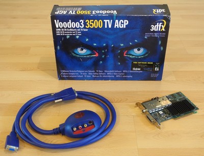 Voodoo 3 3500 TV The Voodoo 3, codenamed "Avenger", was announced at COMDEX in November 1998 and released on April 3, 1999 Following the buyout of STB, 3dfx was now manufacturing their own cards The Voodoo 3 was basically a higherclocked Banshee core outfitted with a second texture unit and some bugfixes. 06 3dfx Voodoo 3 3500 TV AGP Collection resolution Breakout Cable Item Information Condition Used Price EUR Approximately US $ (including shipping) 06 3dfx Voodoo3 3500 TV AGP Sammlungsaufl. 3dfx Voodoo 3 3000 PCI;.