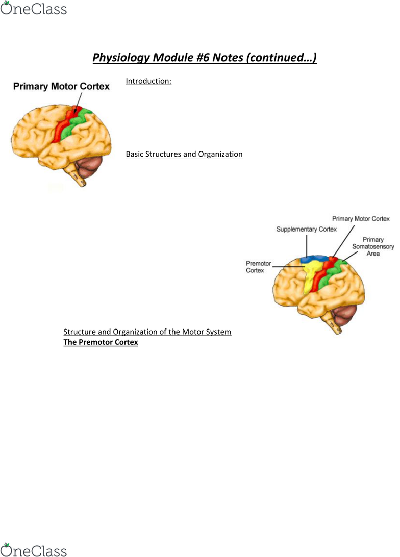 Physiology 2130 Lecture Notes Winter Lecture 6 Premotor Cortex Supplementary Motor Area Prefrontal Cortex