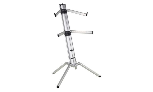 The silver K&M 160 Spider Pro Keyboard Stand is an adjustable doubletier keyboard stand that measures 429' in height for seated or standing positioning and easy setup The 160 SpiderPro is equipped with dualtier support arms as well as with 3/8"16 and 5/8"11 microphone studs for booms, goosenecks, etc.