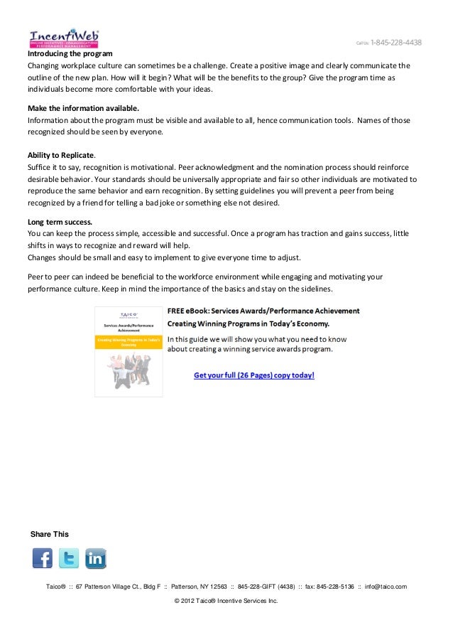That’s a lot of impact for something so easy. In the same recognition program, the recipient of the most approved nominations is similarly rewarded at the end of each year Incorporate Public Recognition A few clients of mine with peer to peer recognition programs feature an employee of the month from each location (chosen from the peer to peer nominations) on their award program website. Peertopeer recognition Defined What is peertopeer recognition?.