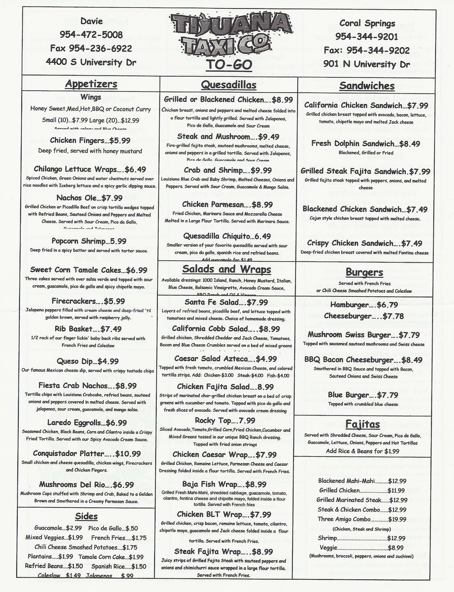 Tijuana Taxi Co Menu Menu For Tijuana Taxi Co Coral Springs Miami