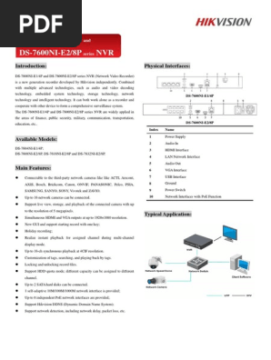 Index Description Index Description 1 Network Interfaces with PoE function (4 interfaces for DS7604NIQ1/4P and 8 interfaces for DS7608NIQ1/8P)) 6 LAN Network Interface 2 AUDIO IN 7 USB Interface 3 AUDIO OUT 8 48VDC power supply 4 VGA Interface 9 Power Switch 5 HDMI Interface 10 GND Physical Interfaces. Wwwm DS7716/32NIE4(E4/16P) Embedded NVR • Thirdparty network cameras supported • Up to 5 Megapixels resolution recording • HDMI and VGA output at up to 19×1080P. DS7600 Series NVR User’s Manual 2 Hikvision® Network Video Recorder User’s Manual This manual, as well as the software described in it, is furnished under license and may be used or copied only in accordance with.
