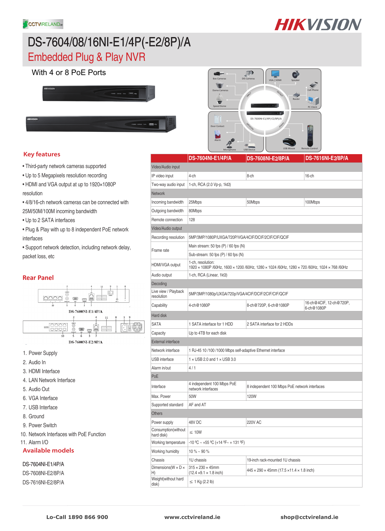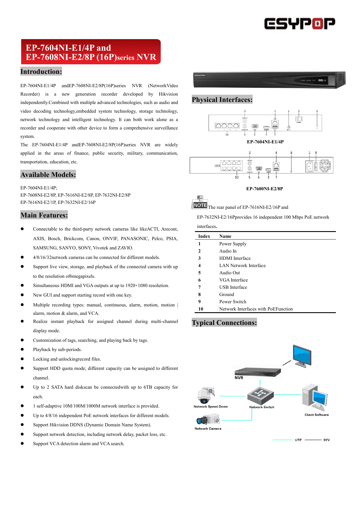 DS7616NIE2/16P, DS7632NIE2/16P Available Models Physical Interfaces The rear panel of DS7616NIE2/16P and DS7632NIE2/16P provides 16 independent 100 Mbps PoE network interfaces DS7600NIE1/4P DS7600NIE2/8P. Index Description Index Description 1 Network Interfaces with PoE function (4 interfaces for DS7604NIQ1/4P and 8 interfaces for DS7608NIQ1/8P)) 6 LAN Network Interface 2 AUDIO IN 7 USB Interface 3 AUDIO OUT 8 48VDC power supply 4 VGA Interface 9 Power Switch 5 HDMI Interface 10 GND Physical Interfaces. DS7616NIK2/16P Check out all of the information we have on this particular product from hires image to Firmware downloads – it’s all here in one place for your convenience.