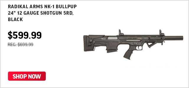 Radikal Arms NK1 Bullpup 12GA 24” 51 GNK1 NIB Item Description This is a newinbox Radikal Arms NK1 semiautomatic shotgun featuring a 24” barrel chambered for 3” 21 gauge shells with adjustable sights in a black finish Comes with factory box, two 5round mags and paperwork.