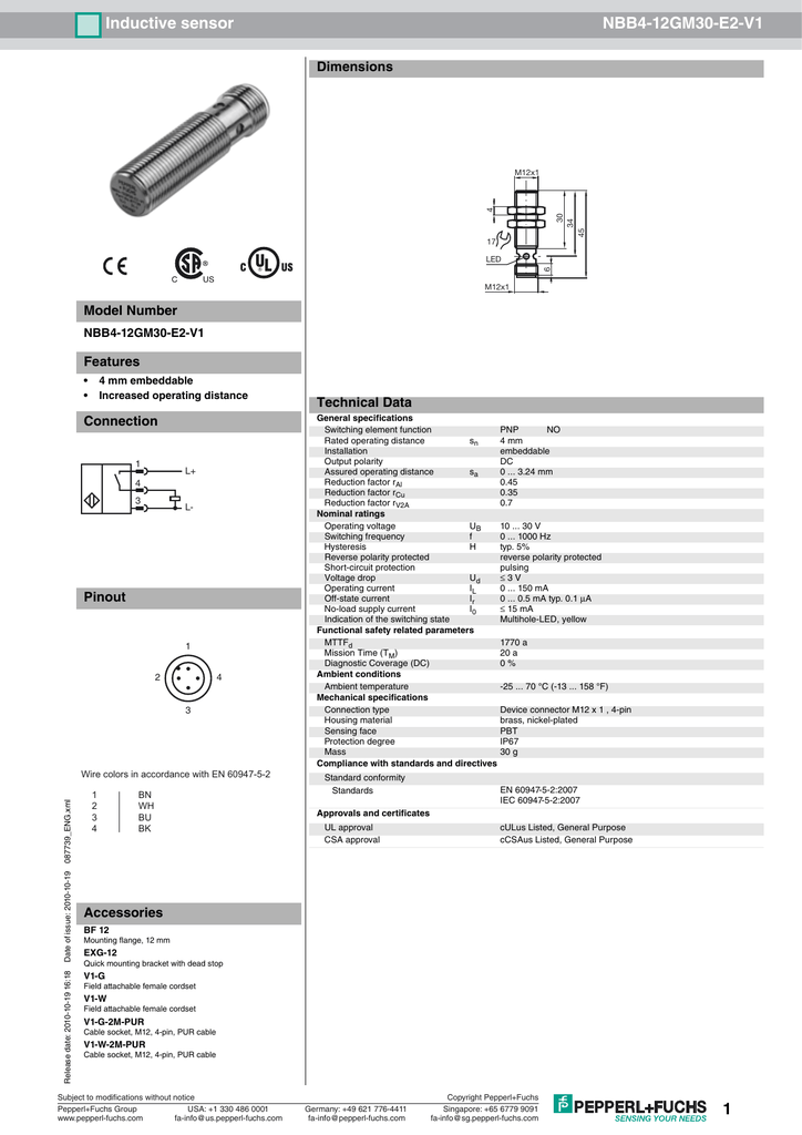 CBC Sales Phone Email sales@carltonbatescom. Give our team a call today on 1 Pepperl Fuchs Pepperl Fuchs, Basic Series, Inductive Sensor, 10 to 30 V dc, 150 mA, 0 to 4 mm Sensing, PNPNO, 500 Hz, Nickel Plated Brass, 45 mm (L) Specification. PepperlFuchs is a leading developer and manufacturer of electronic sensors and components for the global automation market Continuous innovation, enduring quality, and steady growth have been the foundation of our success for more than 70 years PepperlFuchs employs 6,300 people worldwide and has manufacturing facilities in Germany, USA, Singapore, Hungary, Indonesia and Vietnam, most of.