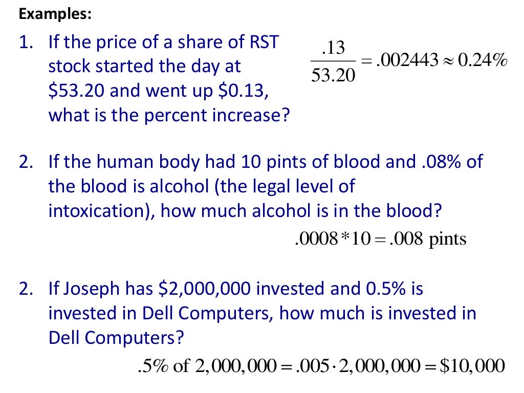 Some examples of percent changes An increase of 100% means that the total is 0% of the orginal amount, in other words, the quantity has doubled An increase of 500% means the final amount is 6 times the original (100% 500% = 600% = 6 times as large) A decrease of 60% means the final amount is 40% of the original (100% − 60% = 40%). 1805 only 78 53 4 1 14 only 36 27 6 1 2 1805 and 14 † 749 506 198 32 13. So, to convert this number to percent, we should multiply it by 100 In this case, multiplying 253 by 100 we get 253 (the value in percent form) The ease way Step 1 Shift the decimal point two places to the right 253 → 253 → 253 Step 2 Add a percent sign 253%;.
