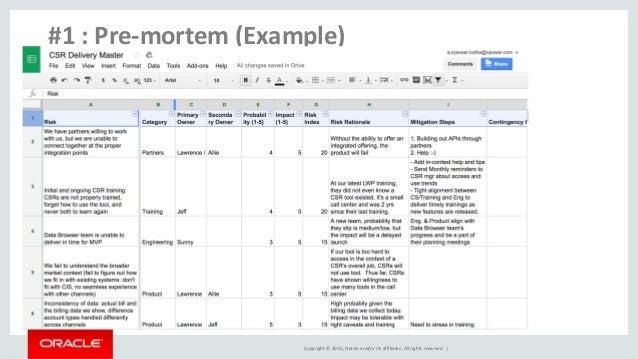 Pre mortem example. 5 Examples of a Premortem A premortem is a risk identification exercise that involves imagining that a proposed strategy, program, project or product has failed and then listing the reasons for failure It is a type of defensive pessimism that typically takes the form "This will fail because " The idea is to let ideas flow to capture as many potential failures as possible. Premortem a better way to plan projects The concept of premortem ("before death") takes advantage of the simple psychological fact that our brain is designed, among other things, to anticipate risks in order to to ensure survival especially from an evolutionary perspective. Approved for Public Release;.