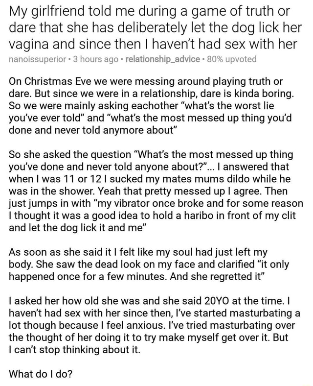 My Girlfriend Told Me During A Game Of Truth Or Dare That She Has Deliberately Let The Dog Lick Her Vagina And Since Then I Haven T Had Sex With Her Nanoissupenor