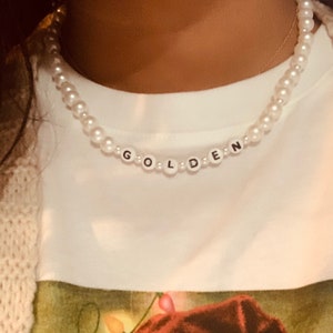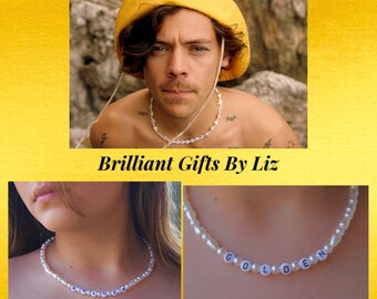 Dec 17, Harry Styles Golden Pearl Necklace Inspired by Harry Styles’ Golden Necklace Made with pearl beads and letter beads Made with stretchy, elastic string Measures approximately 15 1/2” Makes a great gift Message me for any questions.