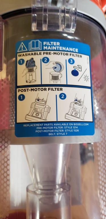 Search BISSELLcom for Style 1214 Maintain the PostMotor Filter Located on the front of the vacuum above the Page 9 Replace the Brush Roll and Belt by looping the Belt over the motor shaft and the Brush Roll Line up the end caps and pull the brush forward into place This will stretch the Belt Return bottom cover back on and replace the.