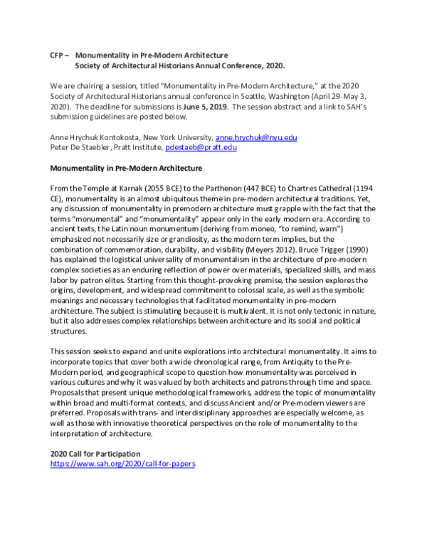 Doc Cfp Sah Monumentality In Pre Modern Architecture Society Of Architectural Historians Annual Conference Seattle Anne Hrychuk Kontokosta And Peter D De Staebler Academia Edu