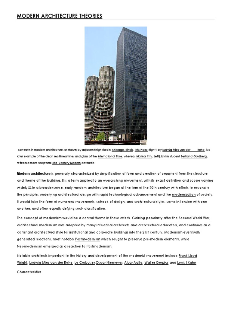Early Modern Architecture Modern architecture emerged in the early th century Modern architecture shows the drastic change in design of buildings, from traditional styles and construction techniques of the past Early modern architects used new materials and technology in. Architecture as cultural ecology, especially in the buildings and landscapes of modern and contemporary architecture The history and theory of the origins of architecture in modern architecture Geometry in architecture including Euclidean, stereotomic, projective and descriptive geometries in premodern architecture;. Earliest architecture came into existence is as yet an unsolved problem This makes the prehistoric era one that is very difficult to define, dating back tens of thousands of years It is considered to be one of Wright's most important structures dating from the first decade of Modern Architecture Developed after WW1, but gained in popularity after WW2 Developed by those against the lavish.
