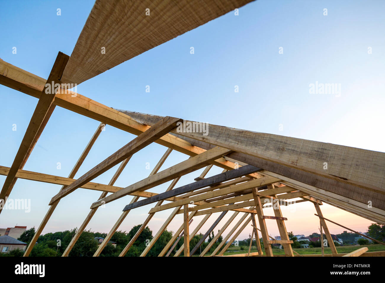 New Wooden House Under Construction Close Up Of Attic Roof Frame Against Clear Sky From Inside Ecological Dream Home Of Natural Materials Building Stock Photo Alamy