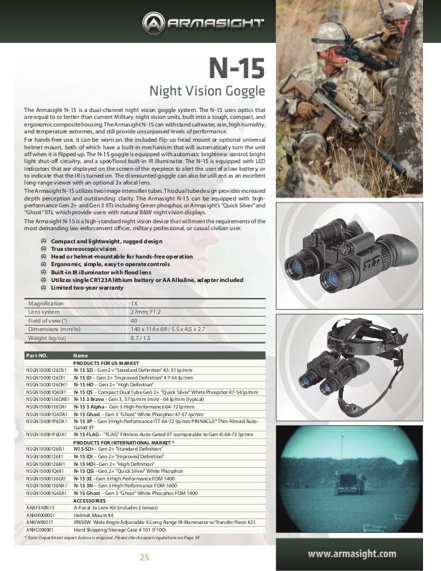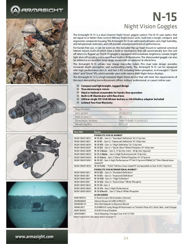 N15 Night Vision Goggles 113 PURPOSE of Equipment To provide the operator with the ability to observe at night under moonlight and starlight conditions The N15 can be used as a handheld, headmounted or helmetmounted device to allow walking, shortrange surveillance, map reading, vehicle maintenance, and administering of first aid. The Armasight N15 is a dualchannel Night Vision goggle system The N15 uses optics that are equal to or better than current Military night vision units, built into a tough, compact, and ergonomic composite housing The Armasight N15 can withstand saltwater, rain, high humidity, and temperature extremes, and still provide unsurpassed levels. Armasight night vision gear are ideal devices for a wide range of purposes, be it tactical, law enforcement, hunting, or observation There are a wide range of night vision monoculars, goggles and binoculars available from the international professionals at Armasight, each one proven in the field and in the laboratory to succeed in any environment Whether you want an affordable and.
