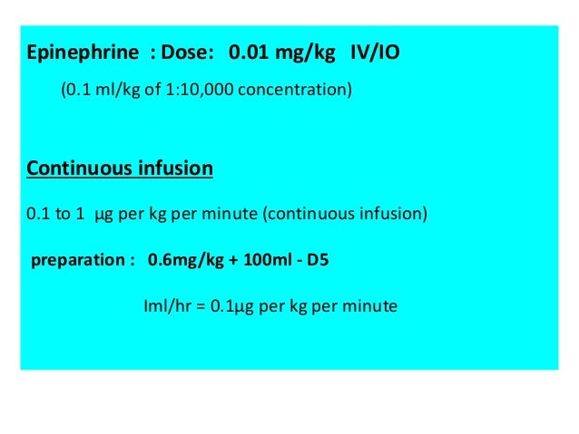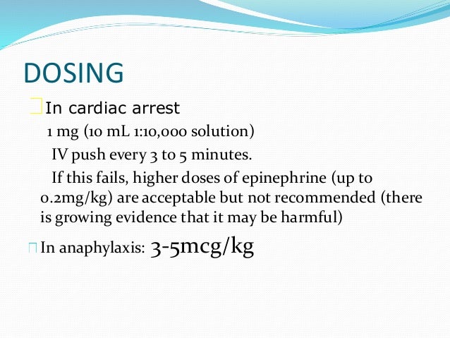 Administer Epinephrine 1 mg/mL 001 mg/kg IM up to a maximum of 03 mg Cardiac Arrest Shockable and NonShockable If there is no Epinephrine 01 mg/mL preloaded syringe, combine in a 10 mL syringe 1mg (1mL) of Epinephrine 1 mg/mL with 9 mL 09% Normal Saline;. Epinephrine dose in mg vs volume to be given Epinephrine 110,000 means 1g 10,000ml That is the same as 1000 mg 10,000ml Which is the same as 1mg10ml That means in an ACLS code situation if. The main effects of therapeutic parenteral doses of Adrenaline are relaxation of smooth muscle of the bronchial tree, cardiac stimulation and constriction of cutaneous vasculature Dose Cardiac arrest IV stat 001 to 003 mg/kg/dose (01 to 03 mL/kg/dose of 110,000) repeated every 5 to 10 minutes PRN.