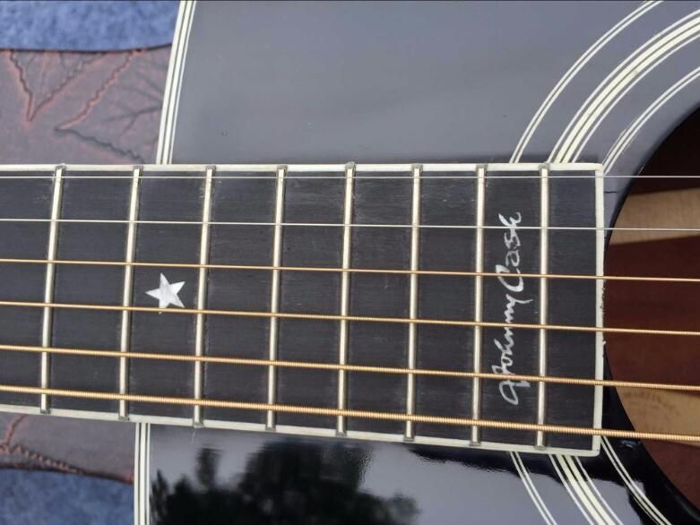 The Johnny Cash D35 isn't just a collector guitar to be hung on the wall Since it is a Martin, it plays and sounds as good as it looks The ebony fingerboard is fitted with abalone stars bordered in motherofpearl position markers, and Johnny's signature is inlaid in pearl between the 19th and th frets.