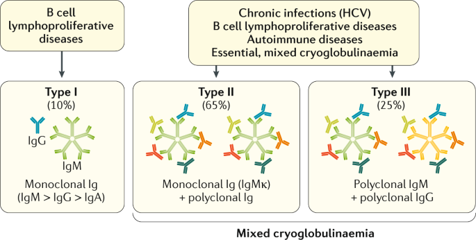 Mixed cryoglobulinemia (MC) is caused by the precipitation of polyclonal immunoglobulin (Ig)M or IgG below 37°C This condition is mainly associated with hepatitis C virus (HCV) but also with autoimmune diseases, such as Sjögren syndrome1 CNS involvement is usually described in MC associated with HCV infection2 and in a recent study, only in 2% of 242 patients with noninfectious MC. Description cryoglobulinemia type II consists of serum immunoglobulins that precipitate at temperatures below 37 degrees C and immunoglobulins are composed of both 2, 3, 4 monoclonal IgM cryoglobulins polyclonal IgG cryoglobulins monoclonal IgM cryoglobulins polyclonal IgG cryoglobulins mixed. Cryoglobulinemia is generally broken down in three subtypes In type I cryoglobulinemia, cryoglobulins are made up of a specific immunoglobulin, usually IgM Type I cryoglobulinemia is usually associated with an underlying disorder, specifically certain types of cancer Type II and type III cryoglobulinemia are known as mixed cryoglobulinemia.