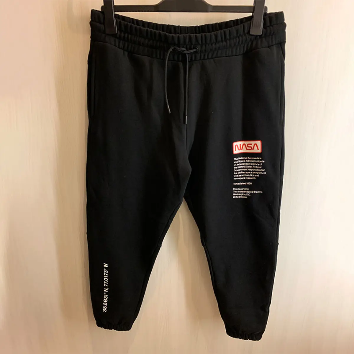 The content of this site is copyrightprotected and is the property of H&M Hennes & Mauritz AB H&M's business concept is to offer fashion and quality at the best price in a sustainable way H&M has since it was founded in 1947 grown into one of the world's leading fashion companies READ MORE. NASA hoodie featuring a worm logo across the chest and flag detailing on the left sleeve Pullover silhouette offers ribbed banding at the cuffs hem for a comfortable fit, complete with an adjustable hood and front kanga pocket **Content Care** \ Cotton, polyester \ Machine wash \ Imported **Size Fit** \ Model is 6’0” and wearing. Sweatpants with a printed design Elasticized drawstring waistband, side pockets, and a back pocket Elasticized hems Soft, brushed inside.