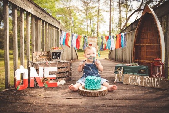 The Big One Paper Banner Bobber Gone Fishing Theme Garland Little Fisherman Baby First Birthday Cake Smash Reel Fun Ideas Ofishally One Photo Props Fishing Tassel Decorations Supplies 47 out of 5 stars 294. Coordinating red, orange, turquoise, lime green, navy blue and white fabrics and trims are cut by hand and tied onto jute twine. The Big One Cake Smash Session This is our full cake smash session We’re pulling out all of the stops and bringing in a balloon garland to pull it all together Let’s start planning your theme Over the top?.
