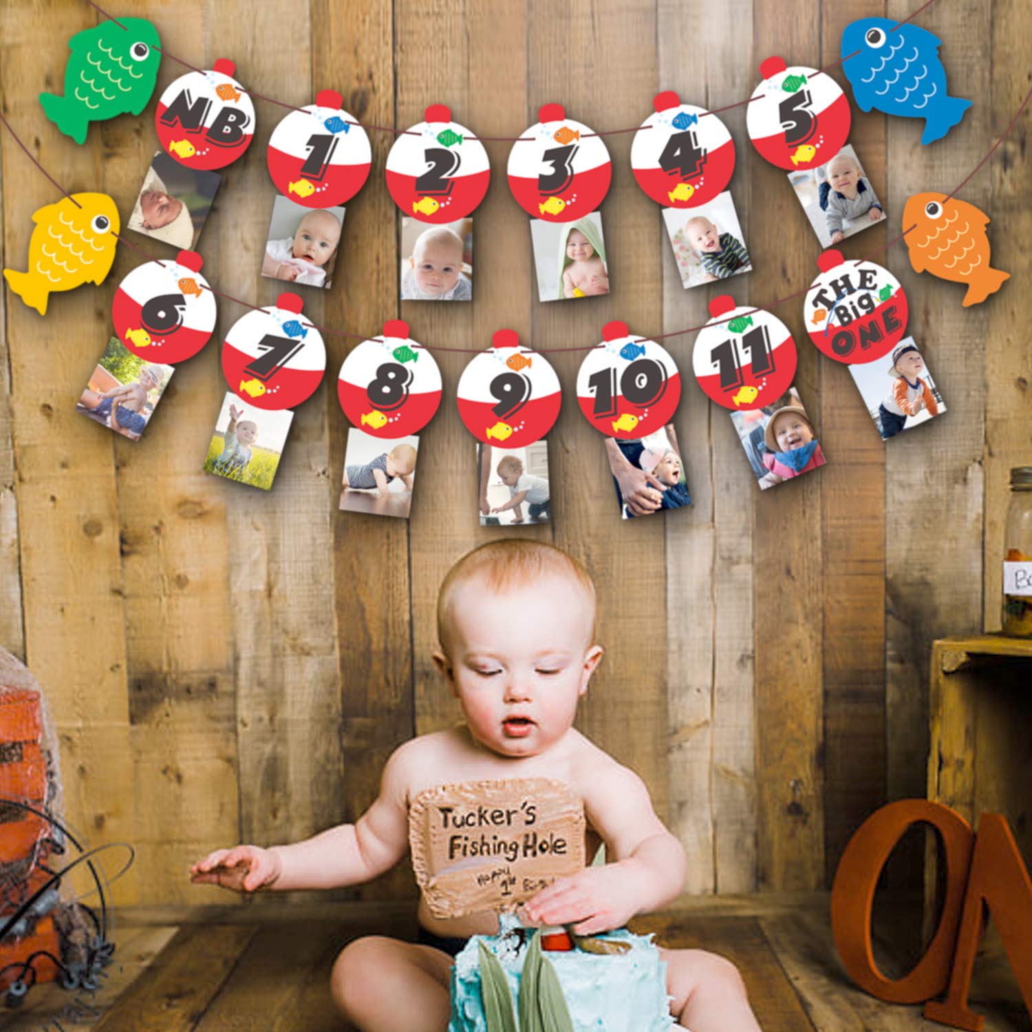 The Big One Bobber Gone Fishing Baby Monthly Photo Banner Little Fisherman First Year Milestone Boys Photo Props Party Cake Smash Decoration Supplies Party Supplies Banners Streamers Confetti