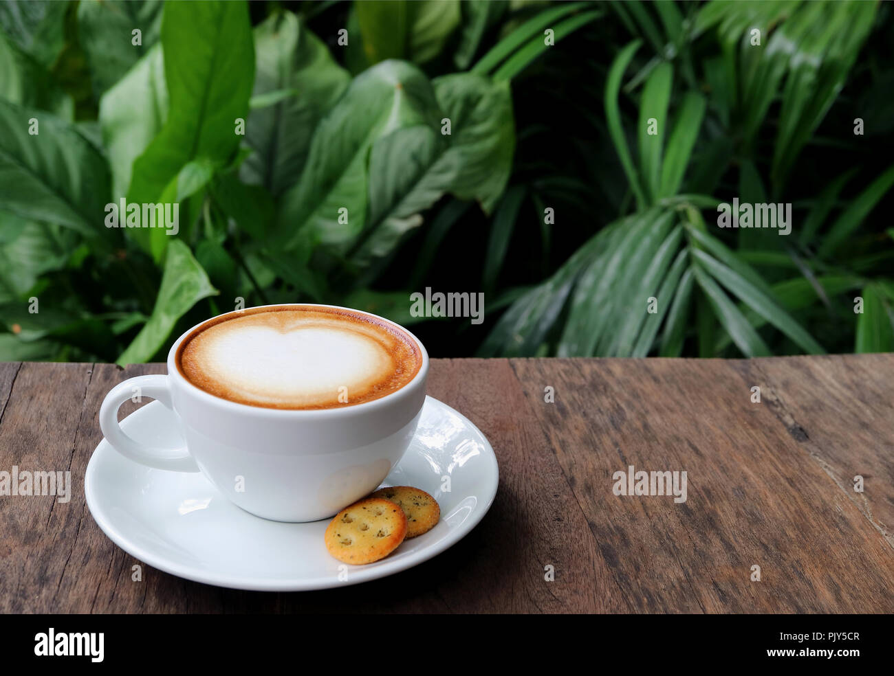 Cup Of Hot Cappuccino Coffee With Cookies Served On Wooden Table With Blurred Green Tree Leaves In Background Stock Photo Alamy
