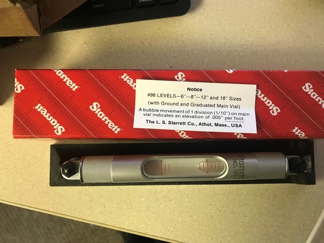 Looking at buying a Starrett 98 level or one of those import 0002" accuracy levels This is for lathe leveling (small lathe) I think the accuracy of the Starrett would be plenty accurate for me;. Ground and graduated main vials;. Starrett 9812 12 inch machinist levelExcellent condition,used very little if even used at all,no bumps or dings,no names or numbers engraved or scratched in the finish anywhere,no disappointments here this is the condition you want to buy precision tools in,I am also listing a 9 View the photos,Feel free to contact me with any questions.