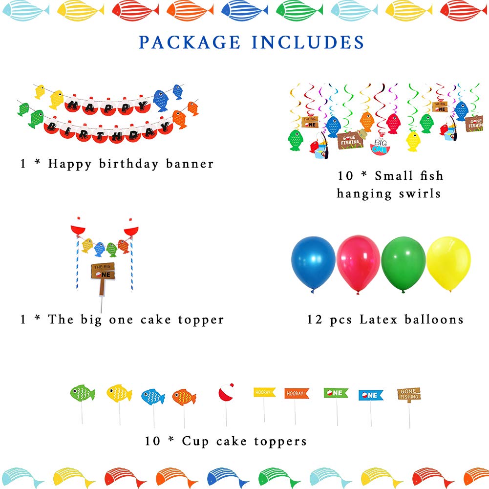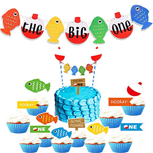 This cake topper is perfect for your first birthday celebration!. Your baby is turning one!. PACK INCLUDE 1 piece THE BIG ONE cake topper, 2 pieces bobber cake topper, 1 strip banner with fish ( the length of the stip is 165") It's suitable for 610 inch cake PREASSEMBLED this set fishing decorating are preassembled, you just need to put on to your cakes, it will save your time.