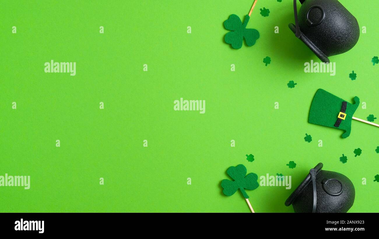 St Patrick S Day Background With Pots Of Gold Shamrock Four Leaf Clover And Leprechaun Hat On Green Saint Patricks Day Poster Template Banner Mocku Stock Photo Alamy